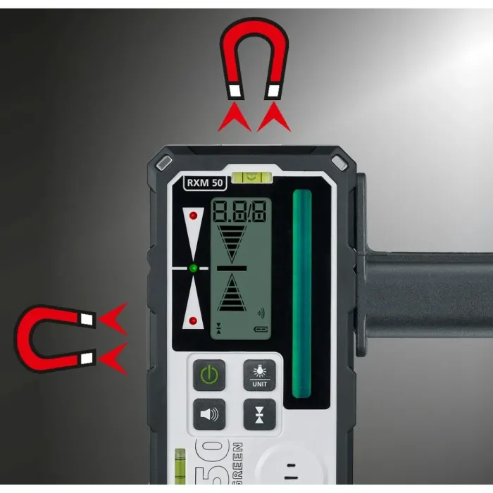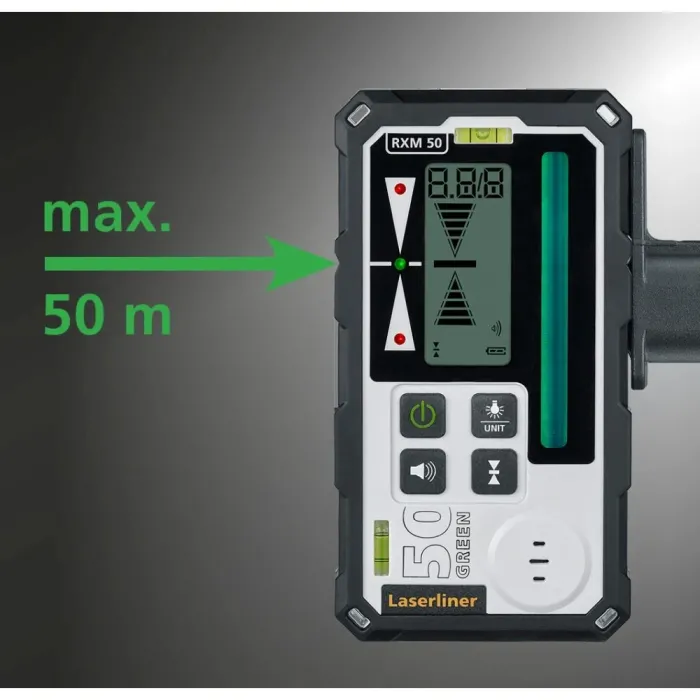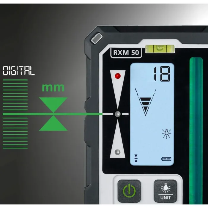 Символът със стрелка и милиметровият дисплей предоставят на потребителите точната разлика във височината между лазерния лъч и маркиращото ниво. Измерената стойност може да бъде бързо и лесно отчетена от големите LC дисплеи от двете страни на приемника. Дисплеят на задната страна на устройството позволява на потребителя да работи в посока, обратна на посоката на излъчване на лазерния лъч, и да отчете измерените стойности. Този лазерен приемник улеснява много бързото нивелиране на близки или дълги разстояния и е подходящ за всички зелени линейни лазери с технология GRX-READY. Той бързо открива пулсиращи, високочестотни лазерни линии до максимално разстояние от 50 метра.