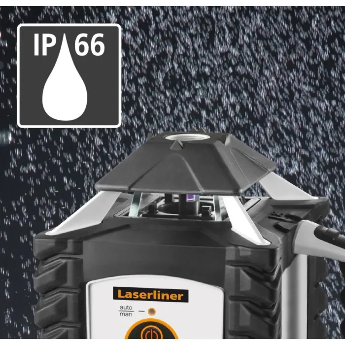Всички функции могат да се управляват дистанционно до разстояние от 40 метра. В случай на външни влияния, автоматичното изключване гарантира, че се избягват грешки при измерването. Специална спирачка на двигателя осигурява отлична защита по време на транспортиране. Приемникът има максимален обхват на приемане от 350 метра. LC дисплеи отпред и отзад на устройството, ярки LED сигнали и звукови сигнали показват височината на лазерния лъч. Този здрав ротационен лазер е идеален за прецизно нивелиране на хоризонтали и наклони на дълги разстояния. Наличните режими включват точково нивелиране, сканиране, ротационен режим и ръчен приемник. Устройството се нивелира автоматично, за да спести време, и има лесно управление с един бутон.