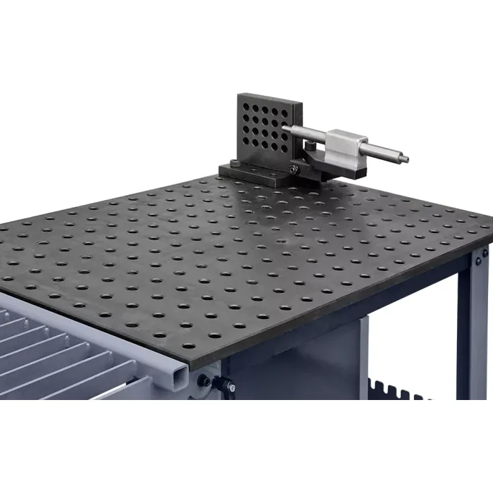Плотът на масата е оборудван с CNC отвори, които позволяват прецизно позициониране и монтаж на части. Това значително опростява работата, позволявайки прецизно и стабилно закрепване на компонентите по време на заваряване. Плотът на масата е покрит със защитно черно азотен оксид (NO) , което осигурява устойчивост на износване, ръжда и заваръчни пръски. Това гарантира, че масата ще запази естетическия си вид и функционалност за дълго време, дори при интензивна употреба.