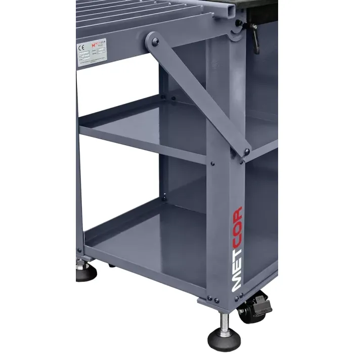 Здравите стоманени крака осигуряват стабилността на масата, а четирите нивелиращи крачета позволяват перфектно позициониране дори върху неравни повърхности. Освен това, краката са оборудвани с колелца, което позволява лесното преместване на масата из работилницата.
