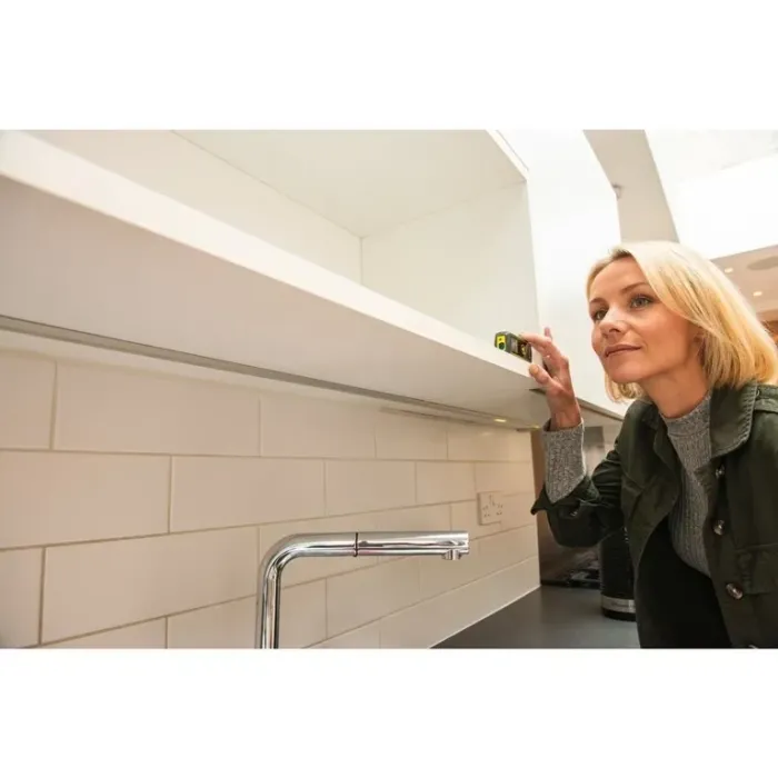 Този лазерен далекомер разполага с индикатор за изтощена батерия и функция за памет, която ви дава контрол по време на проекта. Интелигентната електроника се изключва автоматично след 2 минути бездействие, за да пести енергия от батерията. Този продукт изисква 2 x AAA батерии (включени). Лазерната ролетка е перфектният съюзник за точни измервания в дома. Проектиран да бъде компактен и лесен за употреба, работата му с един бутон, комбинирана с подсветен дисплей, предлага интуитивен начин за измерване на пълни размери на стаи, малки пространства за побиране на нови мебели и много други.