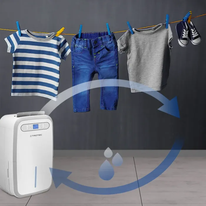 Освен обезвлажняване на въздуха в помещението, обезвлажнителят може удобно да се използва и за сушене на пране – като допълнение или напълно замества конвенционалната сушилня. Функцията за сушене на пране (известна още като режим на сушене на текстил или функция SuperDry) е сравнима с традиционното сушене на въздух на открито.