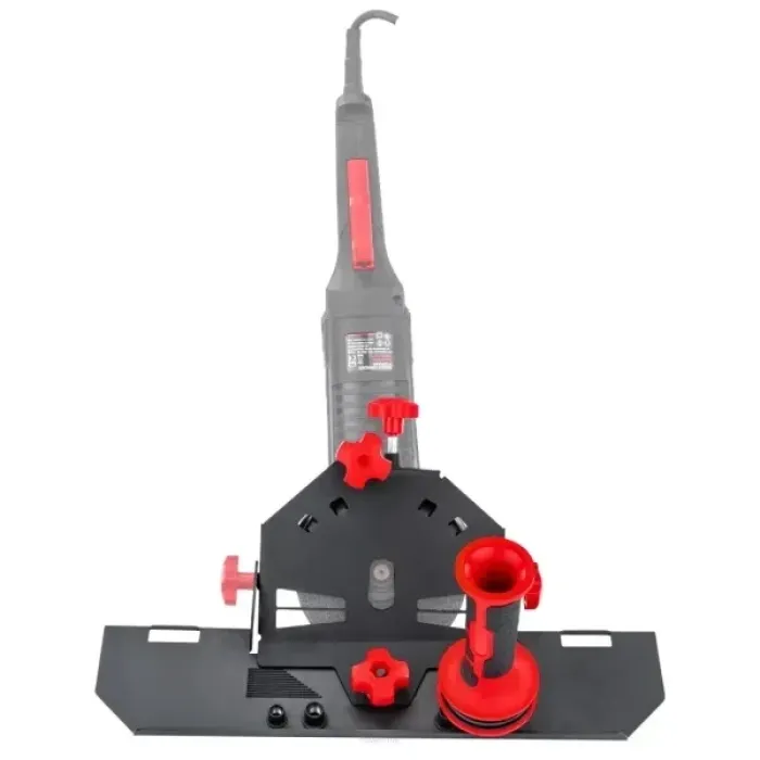 Приставката за ъглошлайф позволява точно рязане на плочки под ъгъл от 45°, което е важно за получаване на естетични и прецизни ръбове. Благодарение на системата за регулиране, инструментът осигурява повторяемост при всяко рязане, което ви позволява да поддържате последователност и качество при много срезове. Дизайнът и ергономичността на приставката позволяват бърза настройка и използване, което значително съкращава времето за работа и ви позволява ефективно да изпълнявате много задачи. Приставката е снабдена с противоплъзгащи подложки, които предпазват плочките от повреда по време на рязане, което е особено полезно при работа с деликатни материали. Здравата метална конструкция осигурява дълготрайна употреба, повишава стабилността и дава възможност за интензивно използване на приставката в професионални условия. Приставката се монтира лесно благодарение на копчетата за регулиране, които ви позволяват бързо да регулирате настройката според нуждите на дадено рязане, улеснявайки работата и избягвайки грешки. Подходящ е за широк спектър от материали, като каменинови изделия, гранит, мрамор, теракота, керамика, естествен и изкуствен камък, което го прави универсален инструмент в довършителната индустрия. Приставката е универсален аксесоар, който може да се използва с ъглошлайфи, оборудвани с дискове с диаметър 125 mm и 115 mm. Това го прави съвместим с популярни модели мелници, което го прави универсален инструмент в работилницата. Тази функция го прави лесен за използване в различни приложения, свеждайки до минимум необходимостта от закупуване на допълнително оборудване.