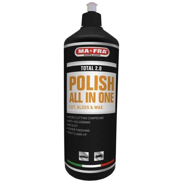 Може да се използва с орбитална полираща машина, ротационна машина или ръчно, като осигурява постоянно висококачествени резултати. Polish Total 2.0 е високоефективен, универсален полир, създаден за корекция на несъвършенства, подобряване на гланц и постигане на завършек, подобен на вакса – всичко в една стъпка. С усъвършенствана абразивна технология, Polish Total 2.0 полира и възстановява повърхностите с изключителна ефективност, което го прави перфектното решение както за професионалисти, така и за ентусиасти. Специално разработен за автосалони, сервизи и детайлинг студиа, този иновативен полир ефективно премахва следи от шлайфане, леки драскотини и окисляване, възстановявайки повърхността до дълбок, гланцов и гладък финиш.