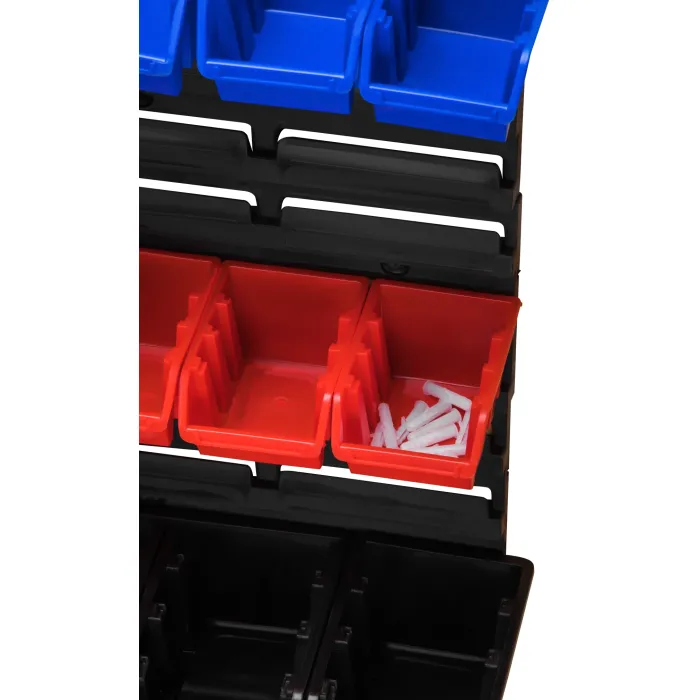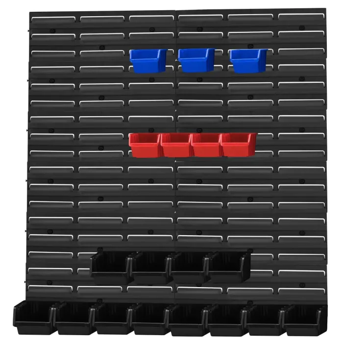 Вместо една голяма дъска, комплектът е разделен на 12 по-малки дъски. Това ви позволява да персонализирате размера и формата на дъската според вашите нужди. Дъската за работилница е практичен комплект, който позволява удобно съхранение, сортиране и организиране на различни малки предмети. Благодарение на многобройните кошчета с различни размери, всеки предмет има свое собствено място, което улеснява поддържането на ред в работилницата, гаража или склада.