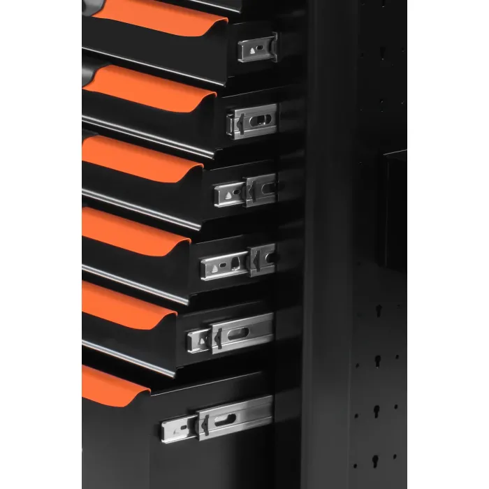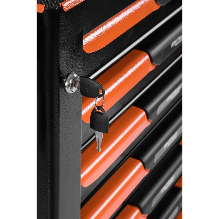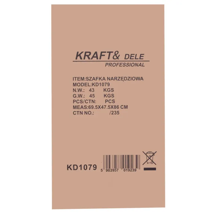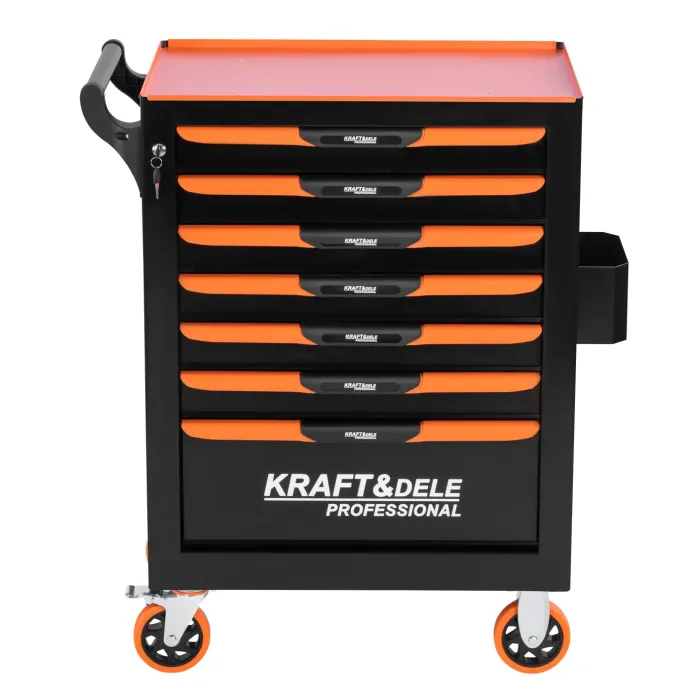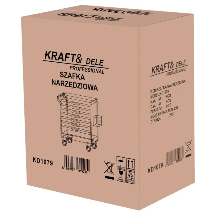 Дизайнът на шкафа осигурява лесна употреба – централна заключваща система защитава съдържанието, а страничен рафт позволява съхранение на допълнителни аксесоари. Моделът KD1079 е незаменимо оборудване за професионалисти и любители на „Направи си сам“. Професионалният шкаф за работилница е стабилно и функционално решение за съхранение на инструменти. Оборудван със седем просторни чекмеджета с пяна подплата, той държи аксесоарите организирани и сигурни. Със стоманен плот, устойчив на повреди и химикали, и заключващи се колелца, този шкаф е идеално допълнение към всяка работилница.
