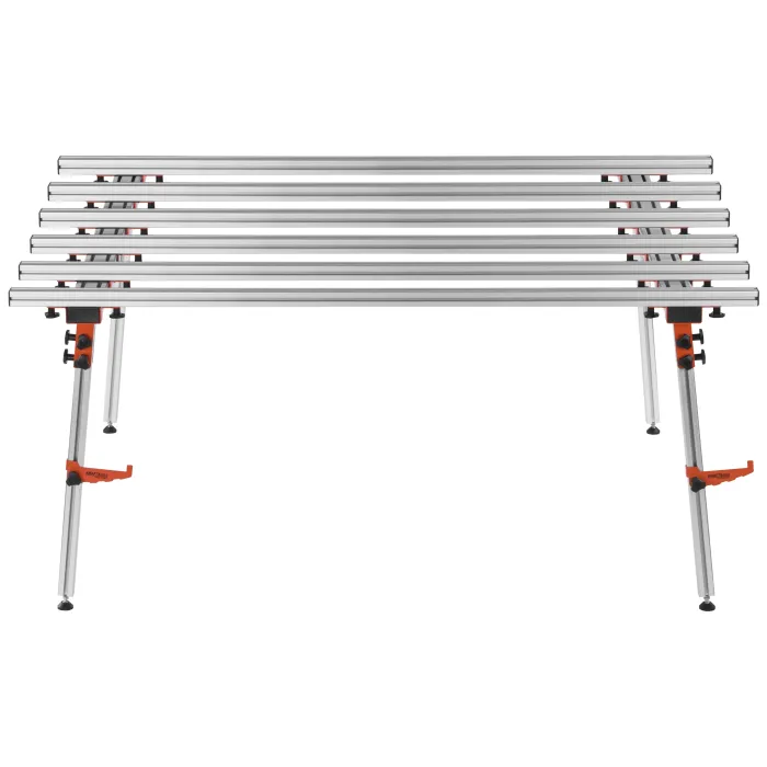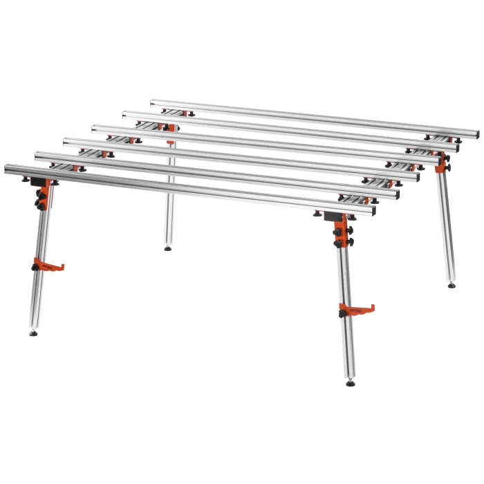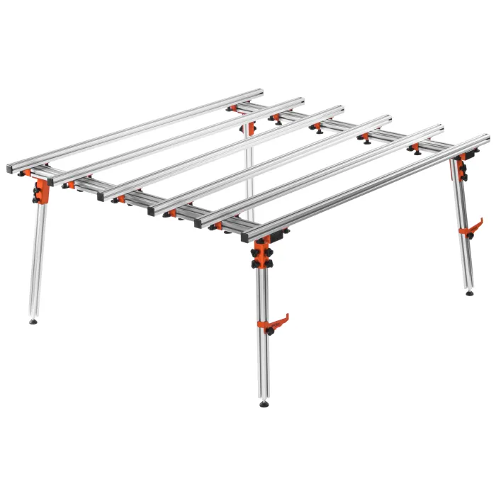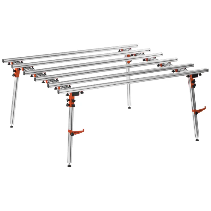 Изработена от здрав алуминий и стомана, тя гарантира дълъг живот и устойчивост на интензивна употреба. Оборудван с шест стабилни крака и максимална товароносимост от 250 кг, той е идеален за работа с тежки материали. Включена е практична чанта за носене за лесно съхранение и транспорт. Работната маса е солидна и стабилна конструкция, предназначена за обработка на плоскости с голям формат. С размери 180x150x80 см, тя осигурява просторна работна повърхност, позволяваща удобно и безопасно сглобяване, рязане и довършителни работи.