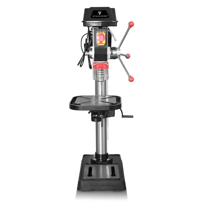 Шпинделът на бормашината, монтиран на сачмени лагери, осигурява плавен ход и стабилност. Масата за пробиване се регулира по височина чрез зъбна рейка и може да се накланя и завърта прецизно. Бормашината има сгъваем предпазител против стружки и здрава метална основа за безопасна работа. Зъбчатият патронник с диапазон на затягане от 3 до 16 мм държи свредлата здраво на място. Вертикалната и колонна бормашина STAHLWERK BD-550 ST е мощна работилническа бормашина за металообработване и е подходяща за взискателни „Направи си сам“ ентусиасти. С мощност от 550 вата и диаметър на пробиване до 16 мм, колонната бормашина позволява прецизно пробиване в дърво, метал и пластмаса. Скоростта на бормашината може да се регулира от 200 до 2800 об/мин чрез ремъчни шайби. Трираменният, странично монтиран лост за подаване позволява оптимално регулиране на контактното налягане и бързо обезвъздушаване на отвора по време на охлаждане. Лесно регулируемият ограничител на дълбочината осигурява възпроизводими дълбочини на пробиване.