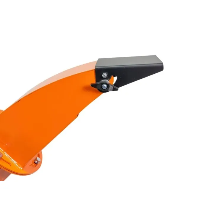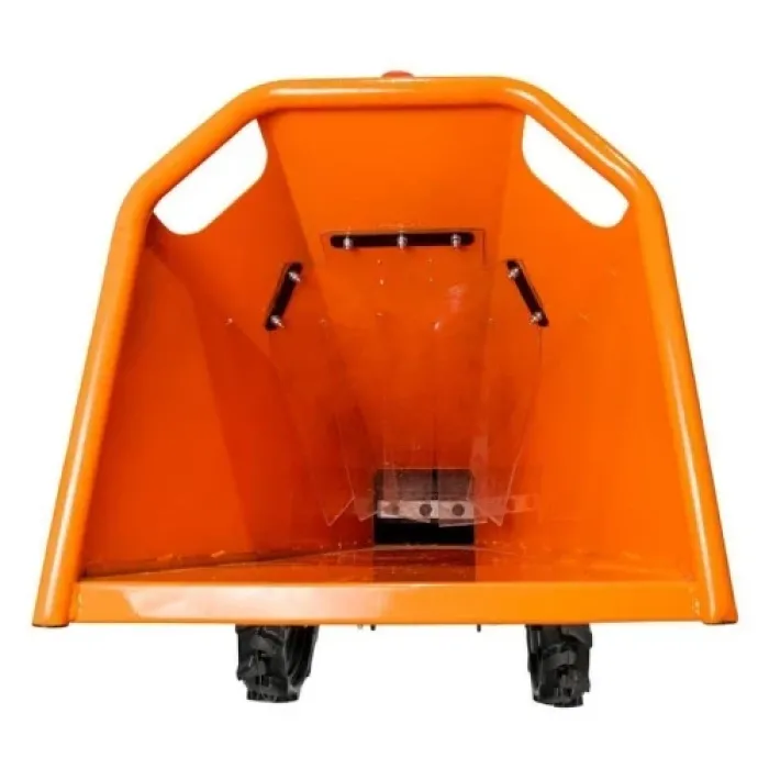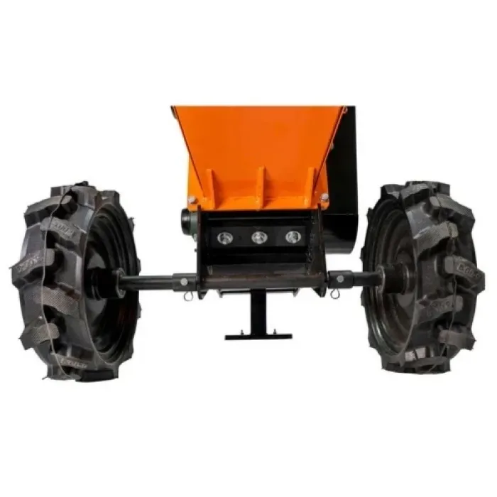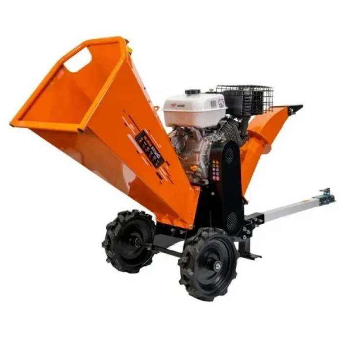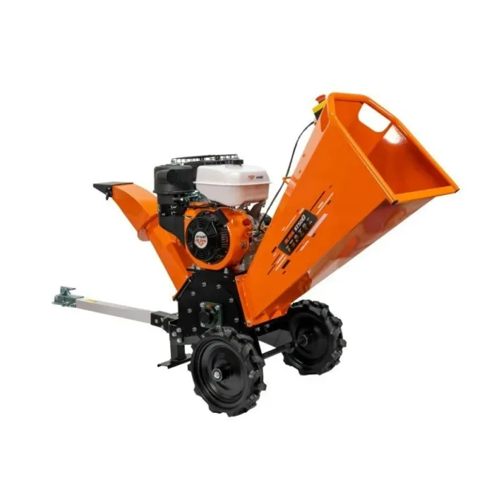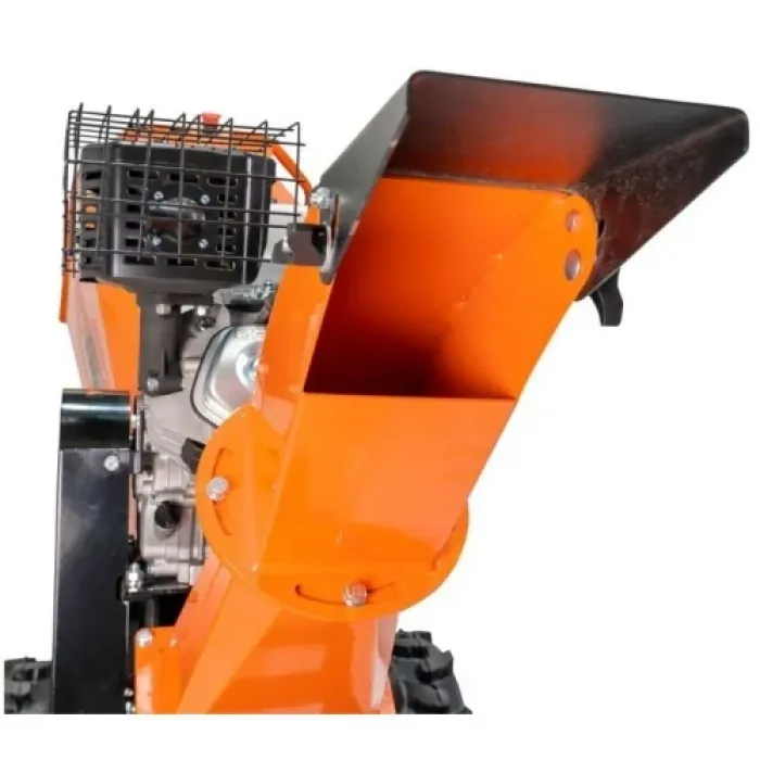 Машината е лесна за придвижване, благодарение на здравата метална рамка и големите гумени колела. Коничният отвор за подаване улеснява зареждането с клони и растителни отпадъци, което прави работата по-ефективна и по-малко натоварваща.