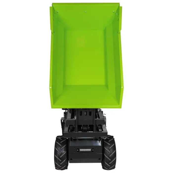 Мини дъмпера е тих, без изгорели газове, идеален и за употреба на закрито. Ножична повдигаща се маса за позициониране на тавата на височина до максимална височина 1,4 м. Мини дъмпера е с хидравлично обръщащо се крило и функция за повдигане (ножица) - вашият помощник за транспортиране на насипни материали.