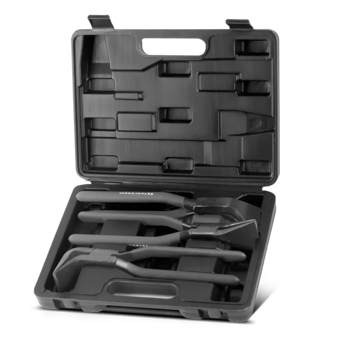 Изработени от устойчива на счупване въглеродна стомана, сгъваемите клещи са изключително издръжливи и могат да издържат на най-високи натоварвания. Ергономично оформената дръжка на клещите за огъване на ламарина осигурява оптимално предаване на силата и ги прави удобни за употреба. Благодарение на висококачественото си покритие, огъващите клещи са изключително здрави и предлагат изключителна стабилност. С ширина на челюстта от 60 мм, здравите сгъваеми клещи са идеални за професионално сгъване, огъване, изглаждане и прегъване на ламарина. Комплектът клещи за ламарина се състои от прави сгъваеми клещи с ъгъл 0° и две ъглови сгъваеми клещи с ъгли 45° и 90°. Независимо дали се използват като клещи за тенекеджийство, клещи за покриви или клещи за водопроводчик - огъващите и прегъващи клещи винаги дават първокласни резултати.