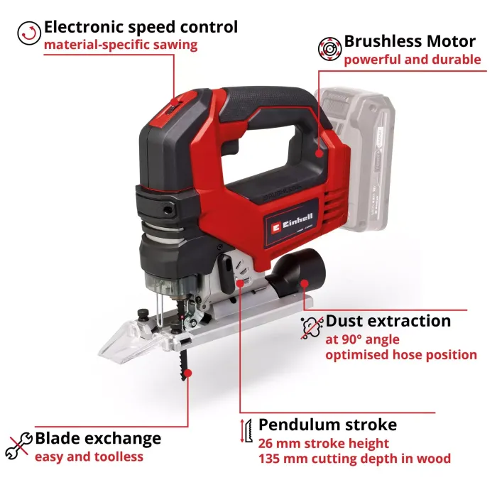 Aкумулаторен прободен трион е перфектният инструмент за амбициозни „Направи си сам“ майстори, които се нуждаят от перфектно рязане на множество различни материали. Като член на семейството Power X-Change, той предлага отлична гъвкавост при работа в дома, работилницата и гаража, тъй като всички устройства, батерии и зарядни устройства могат да се комбинират в рамките на системното семейство. С високата си плавност на работа, акумулаторният прободен трион постига прецизни разрези. За бързи разрези може да се включи махалото. Инструментът се задвижва от безчетков мотор Einhell. Този безчетков мотор осигурява повече мощност и по-дълго време на работа от конвенционалния мотор с въглеродни четки.