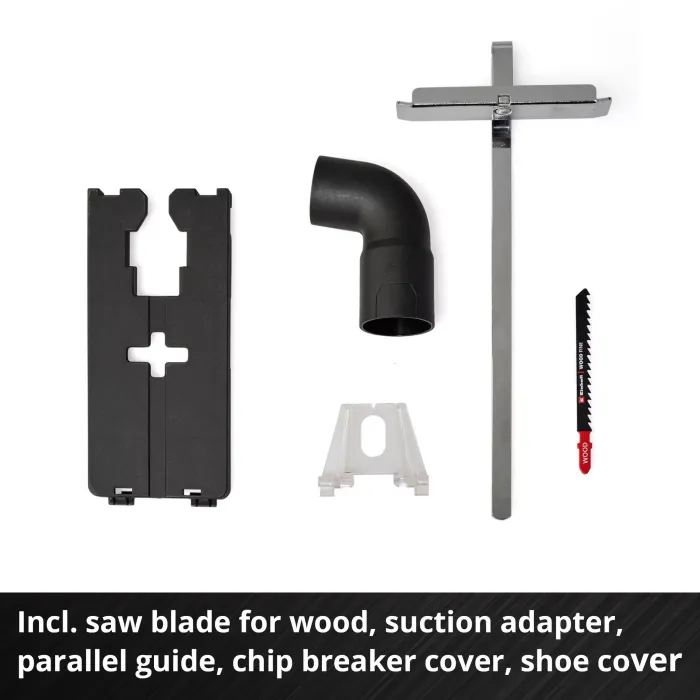 Интегрираната пластмасова плъзгаща се вложка предпазва особено деликатни детайли, а предпазителят против зацепване осигурява безпроблемни разрези. Стабилната алуминиева основна плоча омекотява вибрациите на триона. Включва едно острие за прободен трион за дърво.