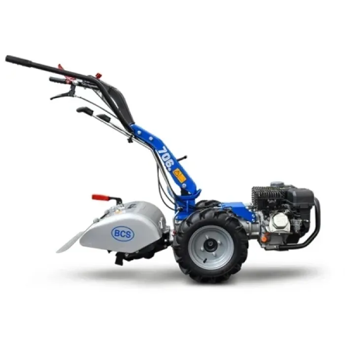При използване на заден инвентар и движение на задна скорост, се изключва силоотводният вал. Мотоблокът BCS 706 SmartSafe е с изключително ниско тегло и компактни размери, идеален за работа в малки частни овощни градини или в тесни пространства. С него ще обработвате почвата, ще косите трева или пък ще почиствате снега. И това са само малка част от задачите, които всеки любител фермер може да изпълнява с този двуколесен трактор. Моделът е оборудван с бензинов двигател GENKINS GK210 с мощност 4,4 kW / 5,9 к.с. Кормилото е антивибрационно, като може да се регулира на височина и да се завърти на 180 градуса, така че да можете да използвате аксесоари, монтирани отзад, като култиватор и плуг. Всички лостове са удобно разположени, а движението напред е разрешено, само ако червеният предпазен лост е активиран. Уникалният SmartSafe съединител с механично задвижвани дискове в маслена баня, не само гарантира максимална надеждност, но и по-голяма икономичност.
