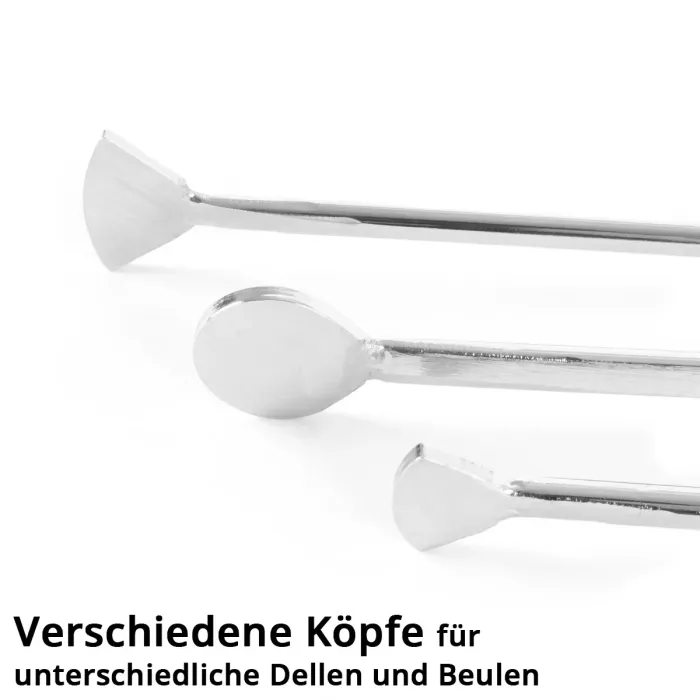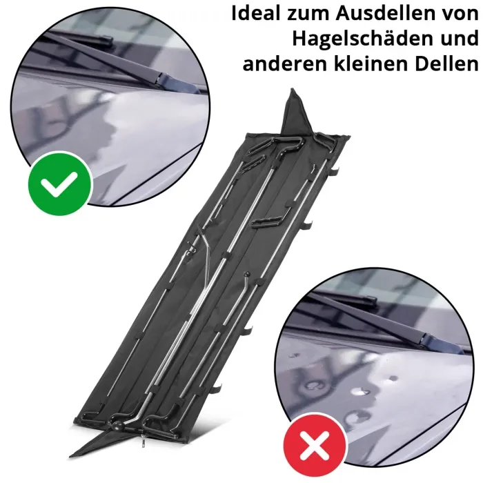 Ергономично оформените, гумирани дръжки на инструментите за отстраняване на вдлъбнатини стоят удобно в ръката и осигуряват оптимално предаване на мощността. Изработени от стомана, устойчива на усукване, прътите за отстраняване на вдлъбнатини винаги осигуряват прецизни резултати при премахване на вдлъбнатини, пукнатини и други повреди по ламарината. Комплектът за интелигентен ремонт се доставя в практична чанта за транспорт. С висококачественото си покритие, инструментът за отстраняване на вдлъбнатини е особено подходящ за професионална употреба в автосервизи, автомобилни сервизи и бояджийски цехове, както и за „Направи си сам“ приложения. Комплексният комплект за интелигентен ремонт на автомобили е идеален за ефективно и щадящо боята премахване на вдлъбнатини и пукнатини, като например щети от градушка. Някои от главите на инструментите за отстраняване на вдлъбнатини имат резба M4 и могат да се комбинират свободно с различните пръти за отстраняване на вдлъбнатини. Това означава, че инструментите за отстраняване на вдлъбнатини могат да се използват гъвкаво и перфектно съобразени с въпросните повреди по ламарината.
