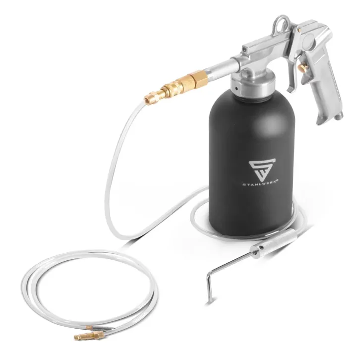 Здравата чаша на пистолета за сгъстен въздух има голям капацитет от 1100 мл и позволява удобна употреба без необходимост от постоянно пълнене. Пистолетът с чаша за налягане работи с вода, боя, лак, восък, грес, защита от долна част на каросерията или от камъчета, която се нанася равномерно върху зоната, която ще се запечатва, през фината дюза. Налягането може да се регулира безстепенно с помощта на интегрирано колело на дръжката на пистолета за налягане. Компактният дизайн и богатият комплект аксесоари с различни маркучи и дюзи позволяват използването на пистолета за защита от ръжда дори в труднодостъпни места. Първокласната изработка на пистолета за кухини осигурява безопасна работа и дълъг експлоатационен живот. Висококачественият пистолет с чаша за налягане е идеален за професионални ремонтни дейности и не бива да липсва във всяка работилница. Практичният пистолет за кухини е перфектният инструмент със сгъстен въздух, когато става въпрос за ефективна защита от корозия. Пистолетът с чаша за налягане надеждно запечатва кухини или пукнатини и осигурява дълготрайна защита срещу атмосферни влияния.