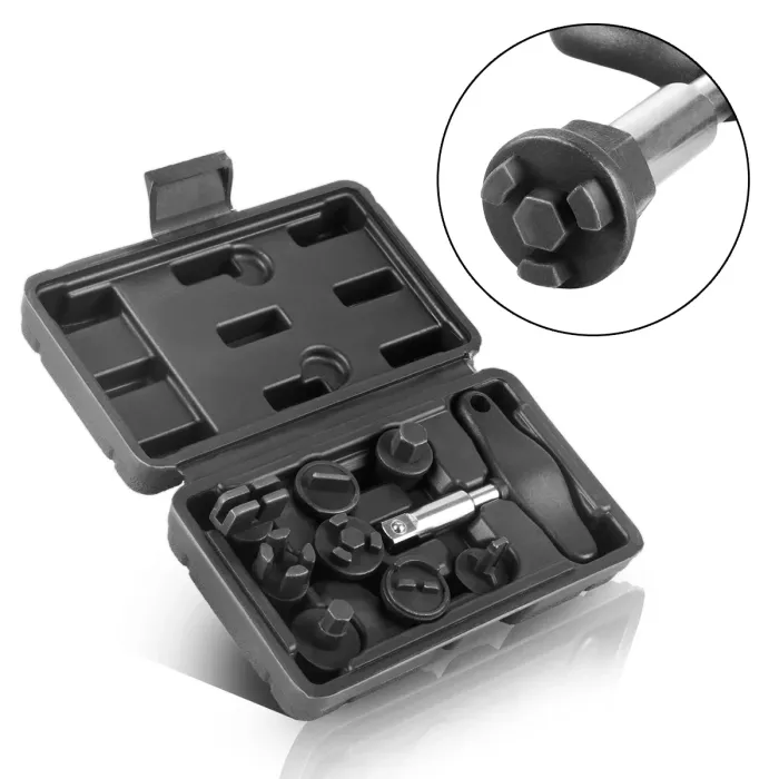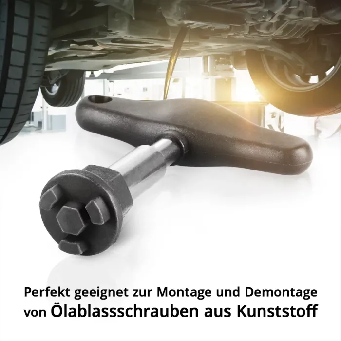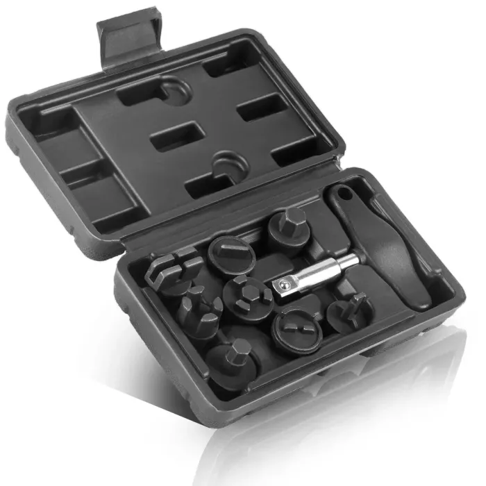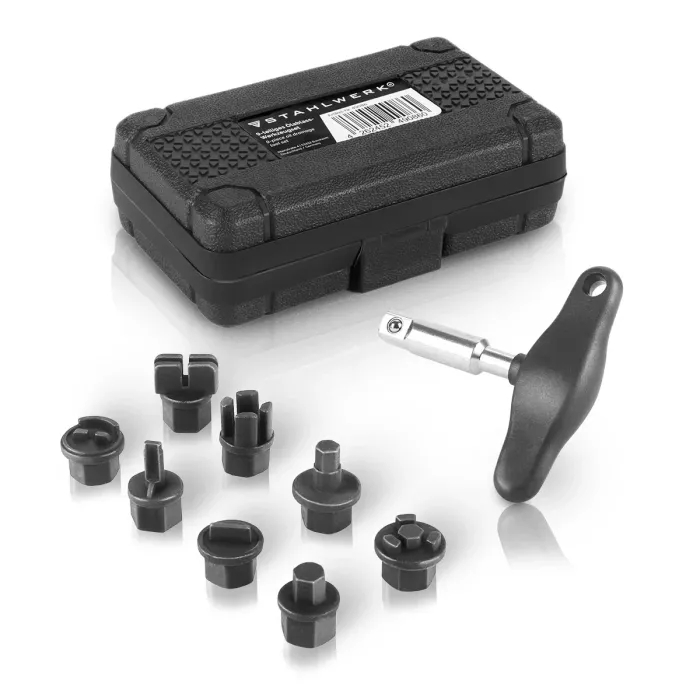 Инструментът за източване на масло е предназначен за пластмасови пробки за източване на масло на най-разпространените типове превозни средства като BMW, DAF, Ford, GM, MAN, Mercedes, PSA и VAG. Специалният комплект за сервиз на масло е с първокласно покритие и е изключително здрав, износоустойчив и може да издържи на най-високи натоварвания. Здравата конструкция осигурява лесна работа и оптимално предаване на мощността по време на смяна на масло. Комплектът втулки за източване на масло се състои от осем втулки и Т-образна дръжка. Инструментът за смяна на масло се доставя прегледно подреден във висококачествена транспортна кутия. Практичният комплект инструменти за пластмасови пробки за източване на масло е идеален за професионална употреба в гаражи и „Направи си сам“. Перфектният инструмент за смяна на масло: Комплектът инструменти за сервиз на масло е идеален за професионален монтаж и демонтаж на пластмасови пробки за източване на масло.