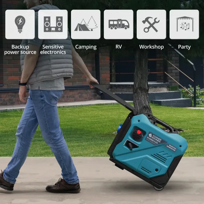 Инверторните генератори Könner & Söhnen са оборудвани с транспортен комплект за удобно боравене. Две колела и дръжка улесняват транспортирането на генератора в мобилни приложения.