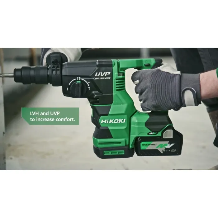 Акумулаторният перфоратор HiKOKI DH1826DA със захват SDS-plus е снабден с безчетков електромотор, който се захранва от 18 V акумулатор. Инструментът осигурява две работни скорости – 0–700 и 0–950 оборота в минута, както и честота на въздействие 0–3170 и 0–4300 удара в минута, с енергия на удара 3.2 J.