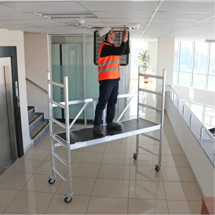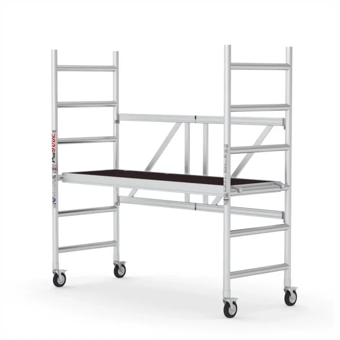 Скелето е подходящо за професионална употреба, вероятно в строителството, поддръжката и други индустриални приложения. Притежава CE сертификат. Професионално мобилно алуминиево скеле. Включва заключващи се колела, стабилизатори с практични съединения и назъбена повърхност на стъпалата за безопасност.