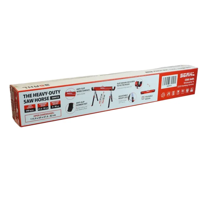 Работната стойка тип магаре STAHL The Heavy-Duty Saw Horse S00916 разполага и с деветпозиционно регулиране на височината, в диапазона от 61.6 до 82 см, което дава възможност за адаптиране към различни задачи и работна среда. Работната повърхност е покрита със специално противоплъзгащо покритие, осигуряващо безопасност и стабилност при работа. За допълнително удобство е оборудвана с прибираща се ръкохватка, която улеснява пренасянето.
