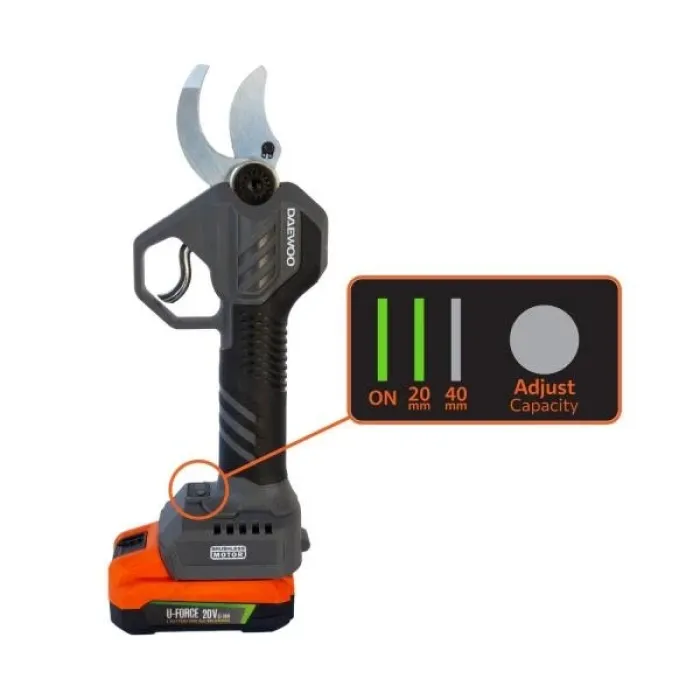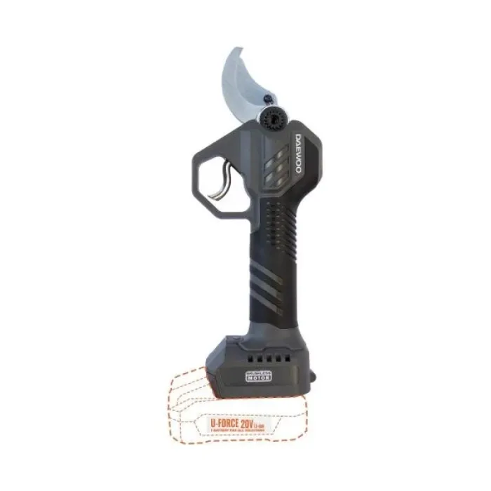 Лекото тяло, ергономичната форма и електронното управление улесняват работата при подрязване на млади и сухи клони. Ножицата работи с батерии от серията DAEWOO U-FORCE 20 V.