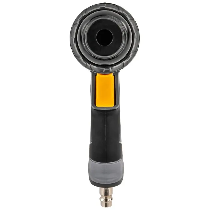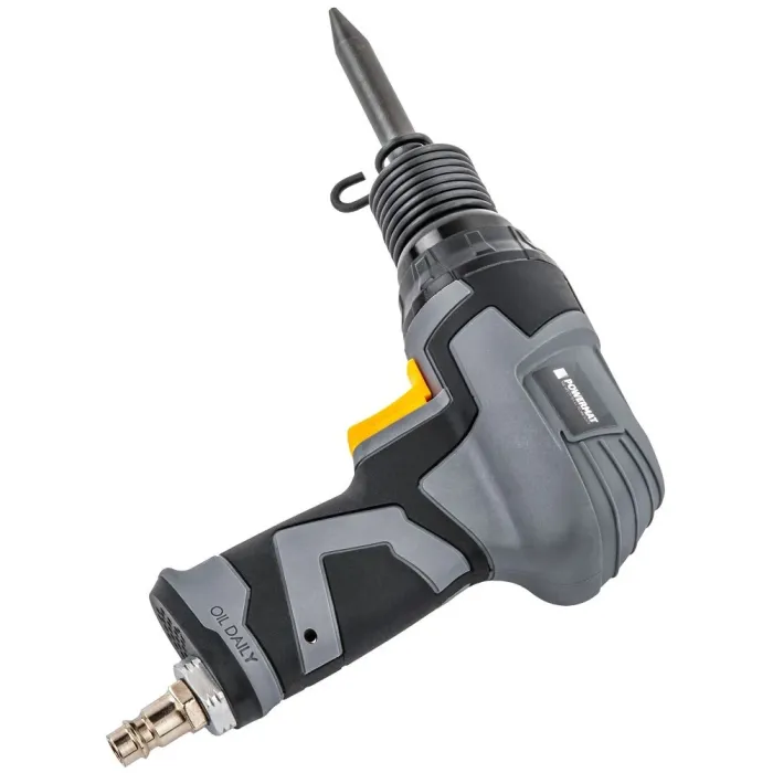 Устройството работи с пневматични системи чрез стандартна 1/4” връзка, което улеснява бързото свързване към компресора. Механизмът за нисък разход на въздух повишава ефективността на работа, като същевременно намалява оперативните разходи и консумацията на енергия. Пневматичният чук генерира 4500 удара в минута, осигурявайки бързо темпо на работа и висока ефективност при обработка на метал. Модерният корпус с форма на пистолет осигурява сигурен захват и максимален комфорт при употреба дори при продължителна употреба.