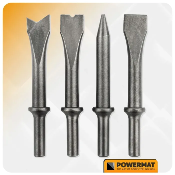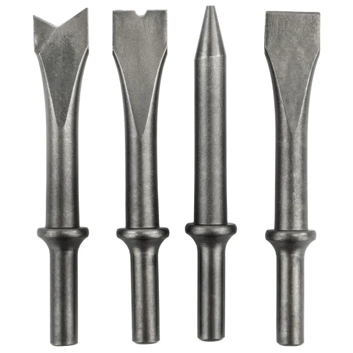 Комплектът включва четири професионални пневматични длета, изработени от закалена стомана, пригодени за дръжка 10 мм .