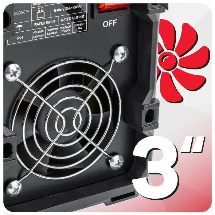 Вграденият 3-инчов вентилатор активно разсейва топлината, поддържайки оптималната работна температура на IGBT транзисторите.