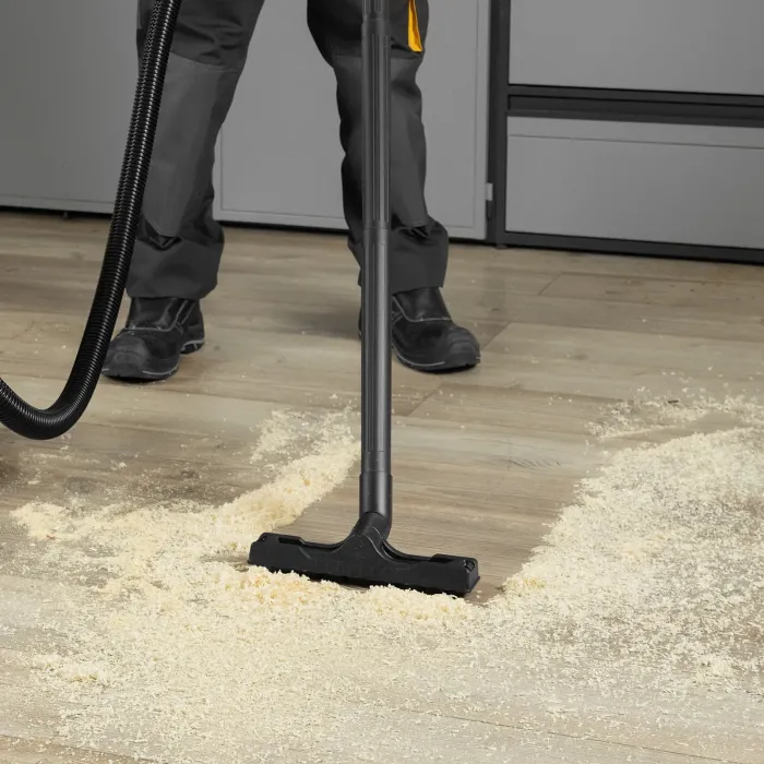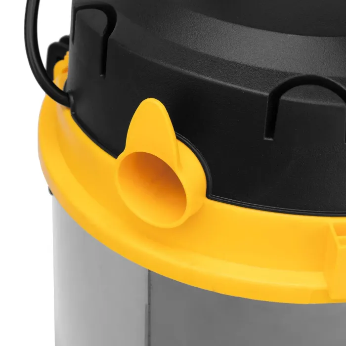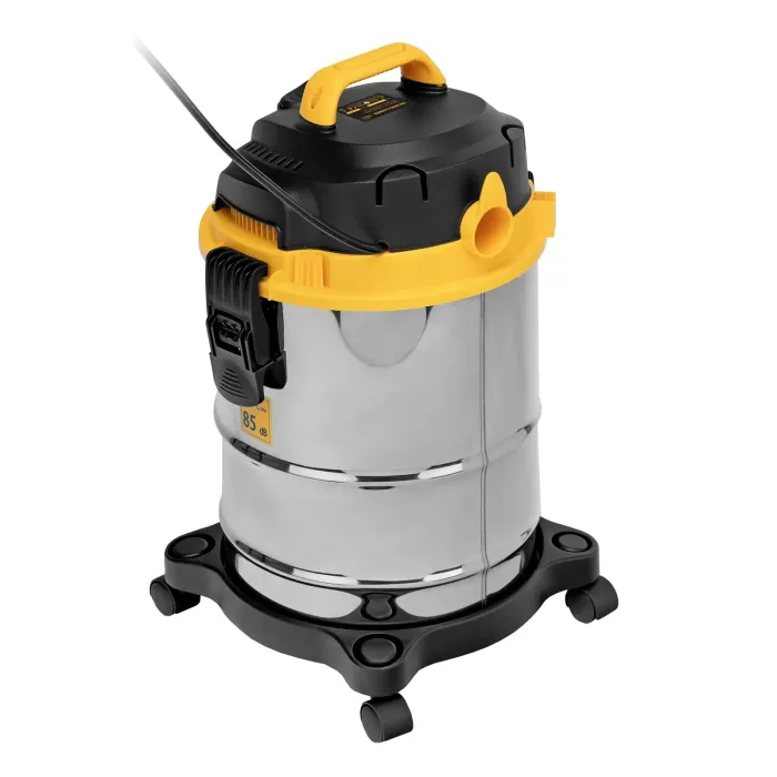 Оборудвана е с 3 м маркуч, който осигурява по-голям обхват на действие. Прахосмукачката за сухо и мокро почистване е с мощност 1200 W и вместимост на контейнера 15 л. Строителната прахосмукачка е мощен и надежден инструмент за почистване на строителни обекти, работилници и гаражи. Компактен и стабилен дизайн, лесна за транспортиране и използване на различни места. Прахосмукачката е оборудвана с вградена електрическа розетка с функция за автоматично синхронизиране, което я прави идеална за работа с електроинструменти, като осигурява автоматично включване при стартиране на свързания инструмент.