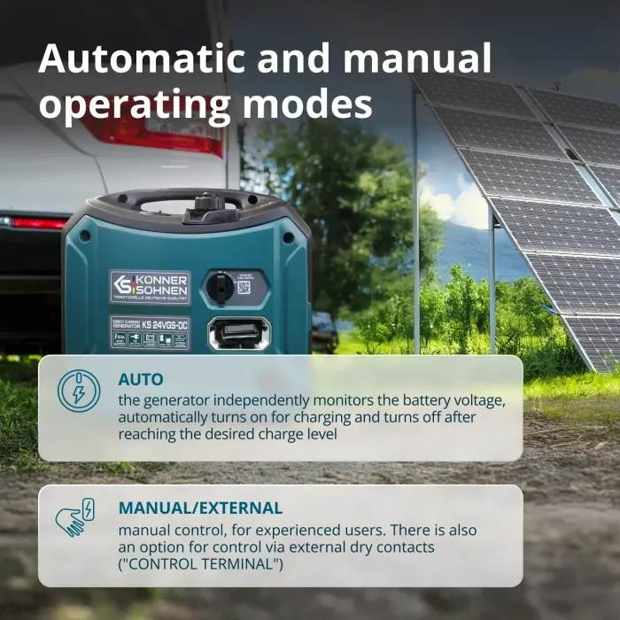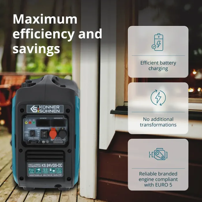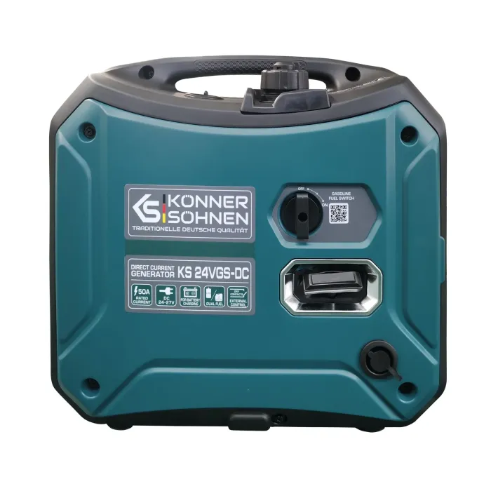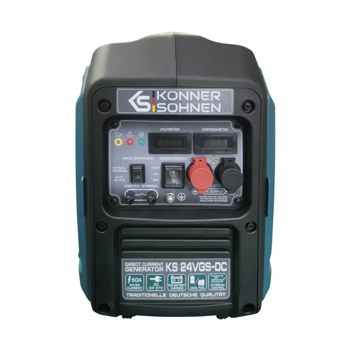 Директното зареждане с постоянен ток елиминира необходимостта от преобразуване на напрежението и намалява разхода на гориво в сравнение с генераторите с променлив ток. Автоматичният режим следи зареждането на батерията, а удобният за потребителя контролен панел опростява работата. Идеален за слънчеви централи, телекомуникационни системи и други. Работи с бензин или пропан-бутан. Звукоизолираният корпус намалява шума, осигурявайки комфортна работа. Генераторът с двойно гориво и постоянно напрежение 24–27V 50A от немската марка Könner & Söhnen® е проектиран като резервно устройство за зареждане на батерии 24–27V, съчетавайки ефективност и лекота на използване.