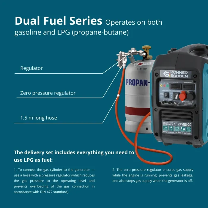 Генераторът може да работи както на бензин, така и на втечнен нефтен газ, което осигурява гъвкавост при избора на гориво. Пропан-бутанът спомага за намаляване на експлоатационните разходи и вредните емисии.