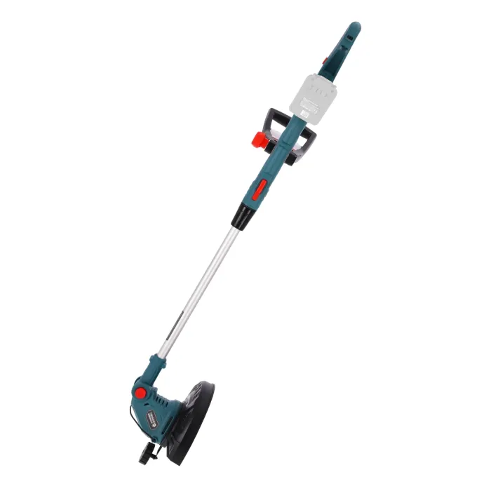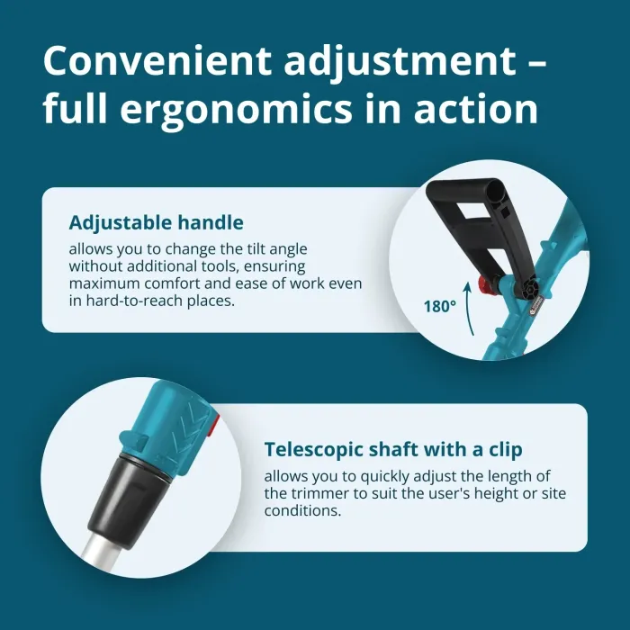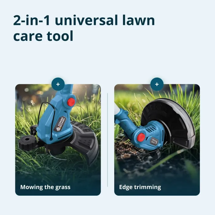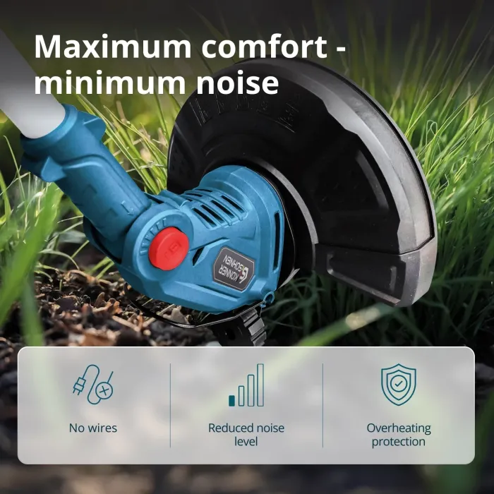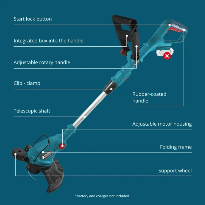 Телескопичният вал с щипка се регулира бързо, което позволява промяна на дължината и режимите на косене. Главата Tap&Go автоматично удължава кордата, а допълнителна глава с пластмасови ножове е ефективна за гъста растителност. Опорното колело подобрява контрола при косенето по краищата. Регулируемият корпус на двигателя позволява оптимален ъгъл на наклон. Безжичен тример от немската марка Könner & Söhnen® – удобен и мощен инструмент за поддръжка на тревни площи. Гумираната дръжка предлага удобен захват, а въртящата се дръжка е лесно регулируема. Сгъваемият предпазител за растения предпазва култивираните растения. Лек, мобилен и лесен за употреба.