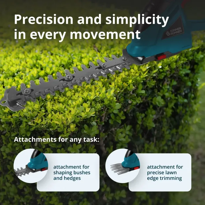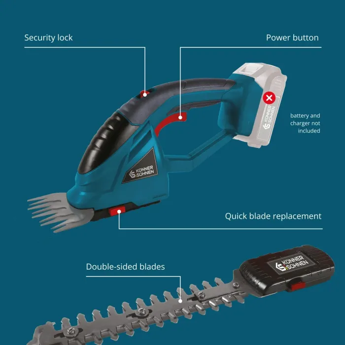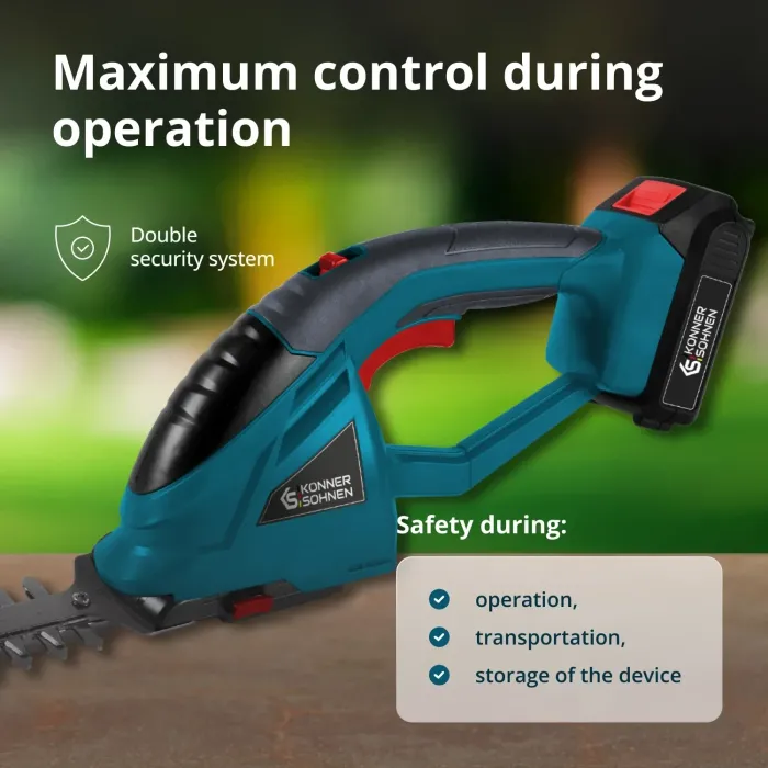 Двойната система за безопасност включва предпазна ключалка и механизъм за предотвратяване на случайно активиране. Системата за бърза смяна на остриетата добавя гъвкавост. Лекият дизайн осигурява удобна употреба и намалява напрежението в ръцете. Благодарение на тези предимства, ножиците са подходящи както за опитни градинари, така и за начинаещи. Отлично решение за поддръжка на вашата градина и създаване на красив пейзаж. Безжични градински ножици за трева и жив плет от немската марка Könner & Söhnen® – удобен и ефективен инструмент за поддръжка на жив плет, храсти и трева. Висококачествените двойни остриета осигуряват прецизно подрязване, а ергономичният дизайн намалява умората, дори при продължителна употреба.