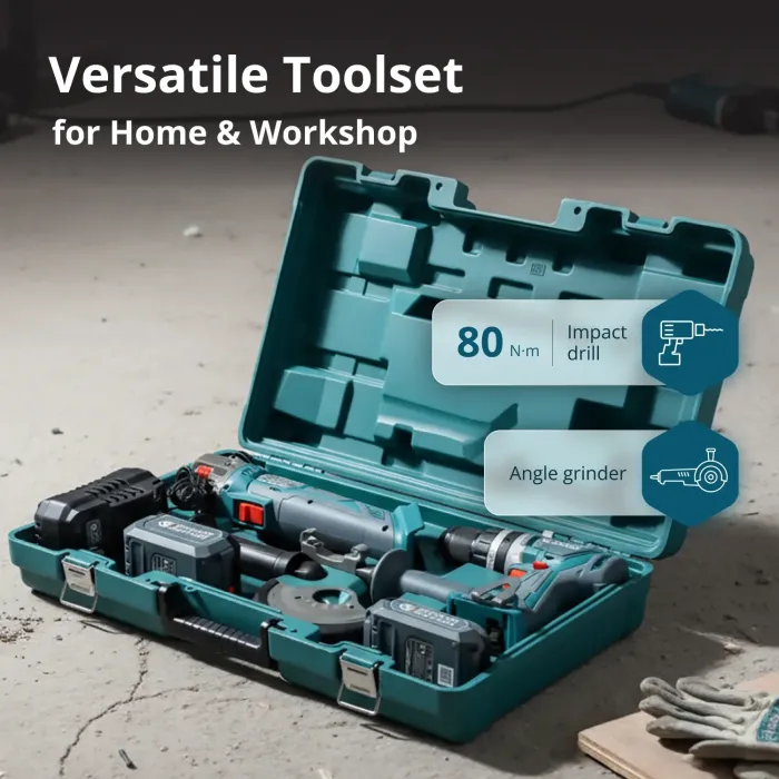 Акумулаторния ъглошлайф включва заключване на скоростната кутия без инструменти, гумирани и странични дръжки за удобен захват, плавно регулиране на скоростта и мек старт. Системата за безопасност предпазва от прегряване, претоварване и презареждане, а шлифовъчната машина има и двоен защитен предпазител. Комплект безжични инструменти в куфар, комбиниращ ударна бормашина и ъглошлайф. Ударната бормашина (80 Nm) предлага три режима на работа – пробиване, завинтване и ударно пробиване – 22 степени на въртящия момент, LED светлина и щипка за колан. Комплектът включва батерии 4.0 Ah и 2.0 Ah и зарядно устройство 2.4 A.
