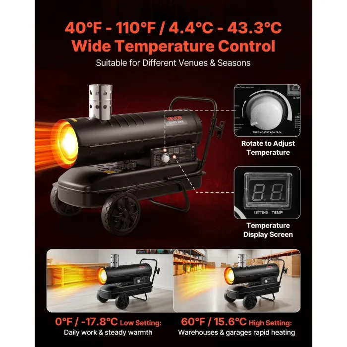 Настройте температурата от 0℉ - 60℉ / -17.8℃ - 15.6℃ с помощта на въртящ се бутон и цифров дисплей. Този преносим керосинов нагревател ви позволява да увеличите топлината през зимата или да я намалите за по-меки дни, което го прави идеален за всички сезони.