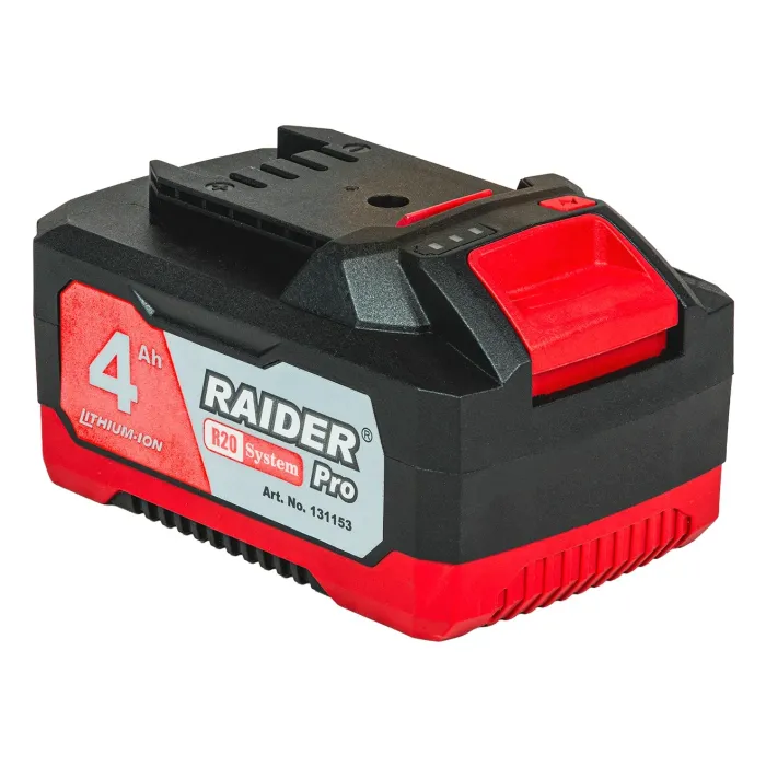 Интелигентното управление на зареждане, контролира всяка клетка поотделно и гарантира пълното зареждане на всяка една от тях. Батерията е съвместима с всички инструменти от R20 System. Батерията разполага с микропроцесорно управление, което защитава ефективно от претоварване и прегряване. Комплект батерия и зарядно устройство Raider RDP-R20 System е с напрежение 20 V и капацитет 4 Ah. Зарядното осигурява максимална безопасност, благодарение на интелигентната си система за зареждане на батерията.