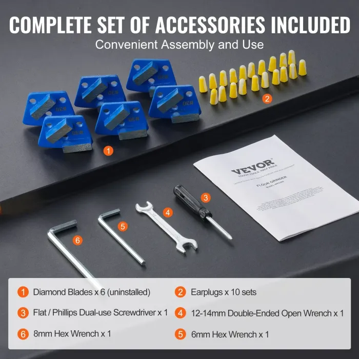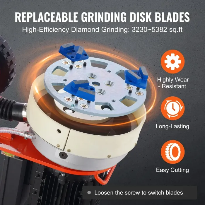 Бетоношлайфът е оборудван със сменяеми шлифовъчни дискове, диамантените остриета ефективно смилат 3230~5382 кв. фута, съвместими с диамантените остриета на пазара, предлагащи превъзходна износоустойчивост, дълъг живот и лесно рязане.