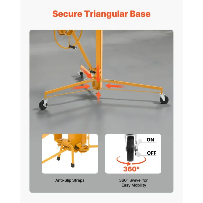 Подемникът за гипсокартон се поддържа от широка триножник с 3 неплъзгащи се заключващи се колела, осигуряващи стабилност и сигурност по време на употреба. Заключващите се крака осигуряват допълнителна опора, което прави конструкцията сигурна, но лесна за преместване.