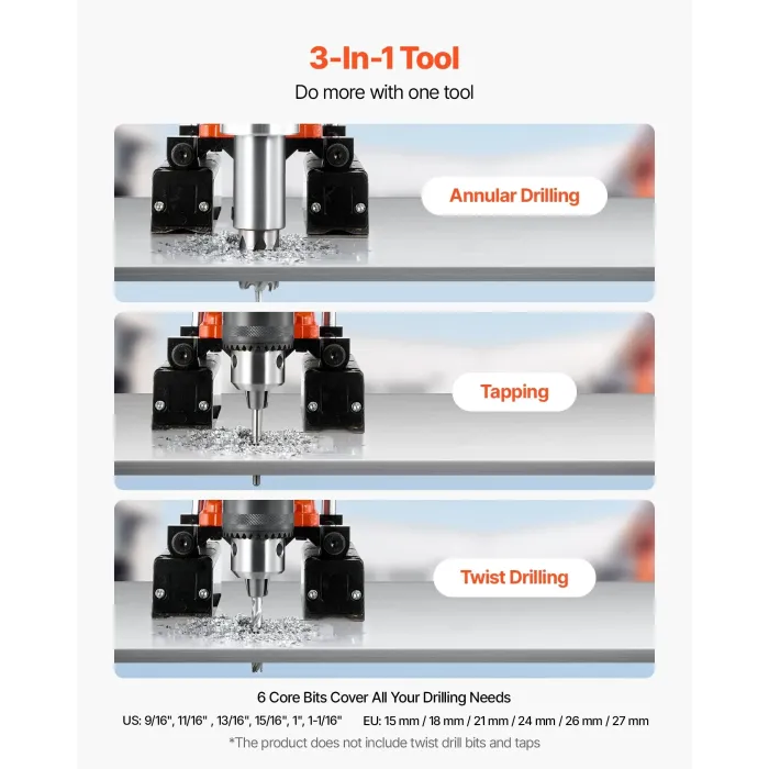 Тази магнитна бормашина комбинира пръстеновидно пробиване, спирално пробиване и нарязване на резба в един инструмент. Независимо дали пробивате отвори в дебели плочи, нарязвате резби на болтове или пробивате в тръби, тя се справя със задачите с професионална прецизност.