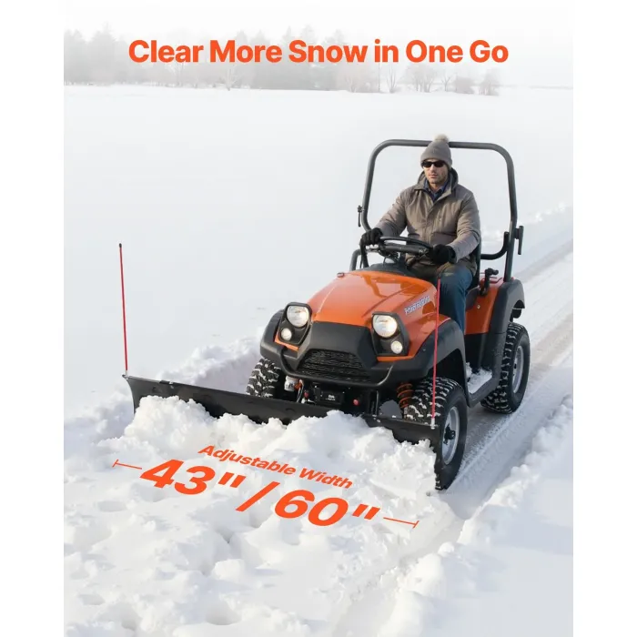 Този снегорин е с две регулируеми настройки на ширината: 43 инча/60 инча, петпозиционно регулиране на ъгъла ляво-дясно (±24,88° макс.) и четиристепенно регулиране на височината. Лесно се справя с тесни алеи, стръмни склонове и дълбок сняг - идеален за сложни терени.