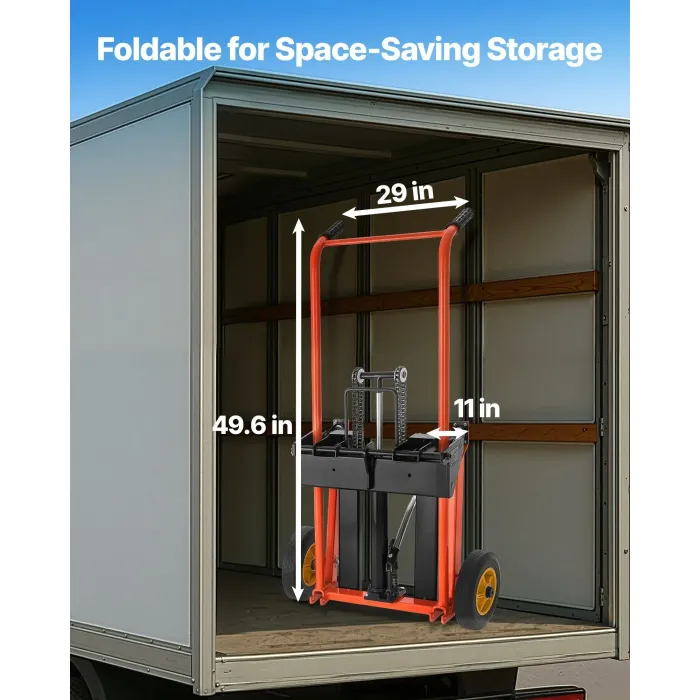Основата и вилиците се сгъват за лесно съхранение. С размери само 122 x 73 x 28 см, когато е сгънат, се побира удобно в камиони или превозни средства, което го прави идеален за употреба във фабрика, склад и супермаркет.