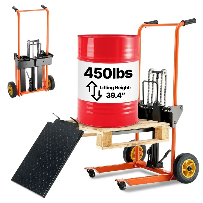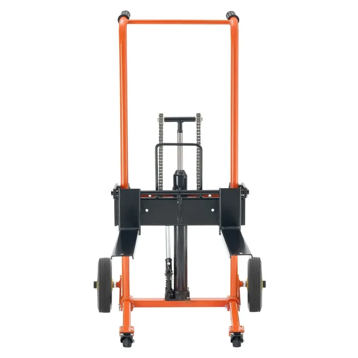 Количката е изработена от материали с високоякостна въглеродна стомана и може да обработва до 205 кг. Неговата хидравлична система с педал плавно повдига вилиците от 2,75 до 39,4 инча, подобрявайки както ефективността, така и сигурността.
