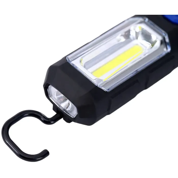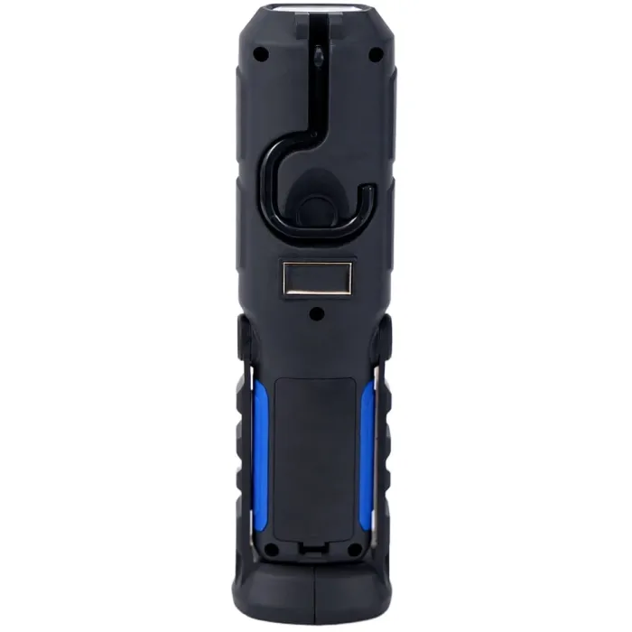 Фенерчето е изработено от издръжлива, гумирана ABS пластмаса, осигуряваща сигурно захващане, устойчивост на механични повреди и комфорт при употреба. Подвижна основа с регулируем ъгъл на наклон позволява стабилно позициониране върху всякаква повърхност, а въртяща се на 360° кука позволява окачването му навсякъде. Освен това, вграденият силен магнит позволява закрепване към метални предмети – идеално за работа под автомобили или върху инсталации.