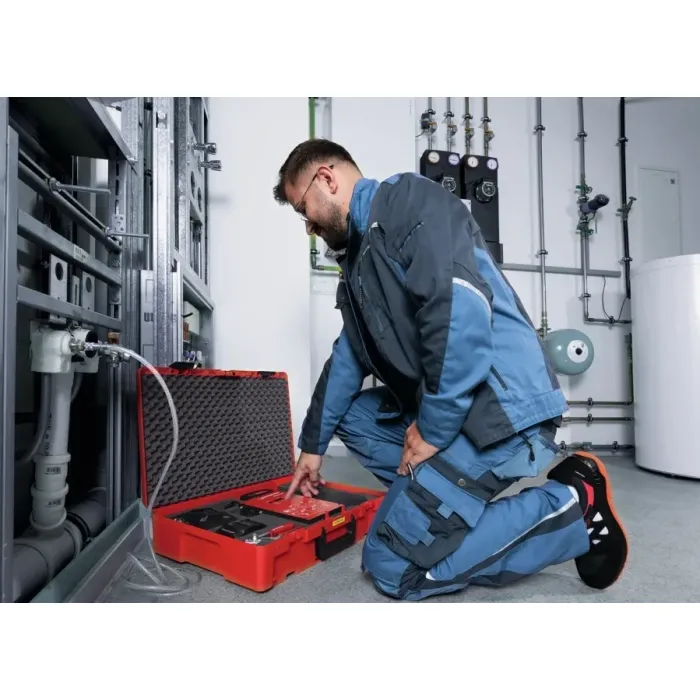 Всички резултати от тестовете се съхраняват директно на устройството и са достъпни по всяко време чрез приложението, където могат да се генерират и тестови протоколи, което ви гарантира, че винаги имате ясен общ преглед. Системата за батерии CAS осигурява свободата на мобилна употреба, докато добре проектираният корпус „всичко в едно“ побира всичко необходимо и предлага място за до две батерии и зарядно устройство. Новият тестов компресор ROTEST AIR комбинира компресор и измервателно устройство. Тази иновативна разработка извършва тестове за течове и налягане до 3 бара без усилие и прецизно, напълно автоматично.