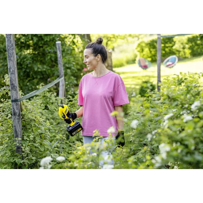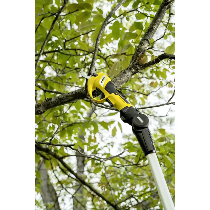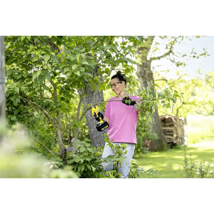 Нежното подрязване също така насърчава здравословния растеж на растенията. Това прави рязането и резитбата на дървета и дървесни растения по-лесни и по-безопасни. Удобна работа над главата: с опционалното телескопично удължение (не е включено в доставката), работата на височина до 3,5 метра също е без усилие и удобна. Лесна поддръжка на дървета с батерия – клони и вейки с диаметър до 2,5 см не са проблем за акумулаторната ножица за клони на дървета на Kärcher. Благодарение на мощното си байпасно острие, рязането е особено прецизно и не изисква усилие.
