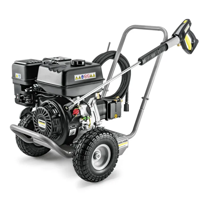 Интегрираният бензинов двигател (EU STAGE V) позволява автономност от външни източници на захранване, колелата с въздух гарантират необходимата мобилност на мястото на употреба, а ергономичната дръжка за бутане и практичното съхранение на аксесоари осигуряват лесна работа. Компонентите, защитени чрез термо и предпазни клапани, са лесно достъпни. Стабилната тръбна стоманена рамка на HD 6/15 G Classic също така надеждно предотвратява повреди, причинени от външни механични въздействия. Компактната HD 6/15 G Classic е идеалната машина за начинаещи в света на бензиновите, мобилни водоструйки със студена вода на Kärcher. Изключително лесно транспортируема в автомобил, тя може да изпълнява дори по-взискателни задачи за почистване, например на строителни обекти или в общини, с работно налягане до 150 бара, здрава помпа с колянов вал и обем на водата до 600 литра на час.