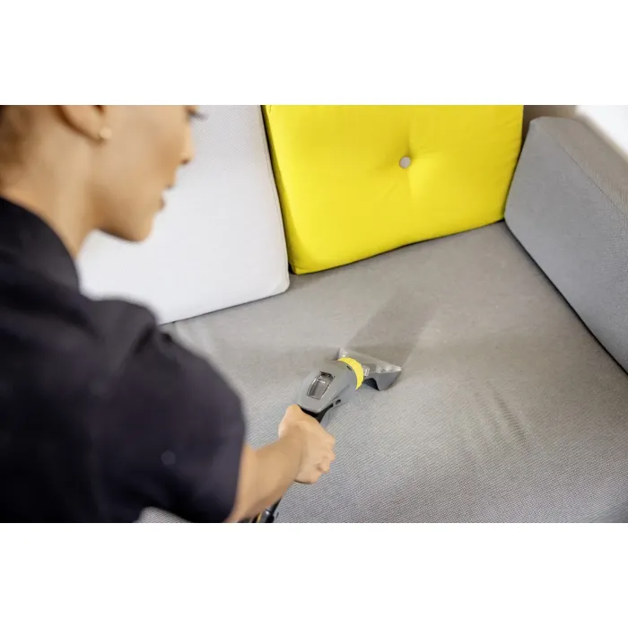 Дълбокото впръскване на почистващия разтвор в текстилните влакна и последващото засмукване с отлична обратно засмукваща мощност означава, че текстилът изсъхва бързо и може да се използва отново. Екстракторната машина се предлага стандартно с дюза за тапицерия, за особено тесни зони, като например интериора на превозни средства. Големите бутони, които могат да се управляват с ръка или крак, са изключително удобни за употреба. Транспортирането е лесно и с една ръка благодарение на ергономичната дръжка за носене. Капакът на уреда и ръчната дюза са прозрачни, за да се осигури по-добра видимост към мръсната вода. Екстракторната машина има практична кука за кабел за безопасно съхранение на захранващия кабел и следователно за лесно транспортиране и съхранение на машината. Впечатлява с първокласни, хигиенични резултати от почистването и висока ефективност: здравата екстракционна машина Puzzi 10/1 с дюза за тапицерия от Kärcher за премахване на петна от малки до средно големи текстилни повърхности.