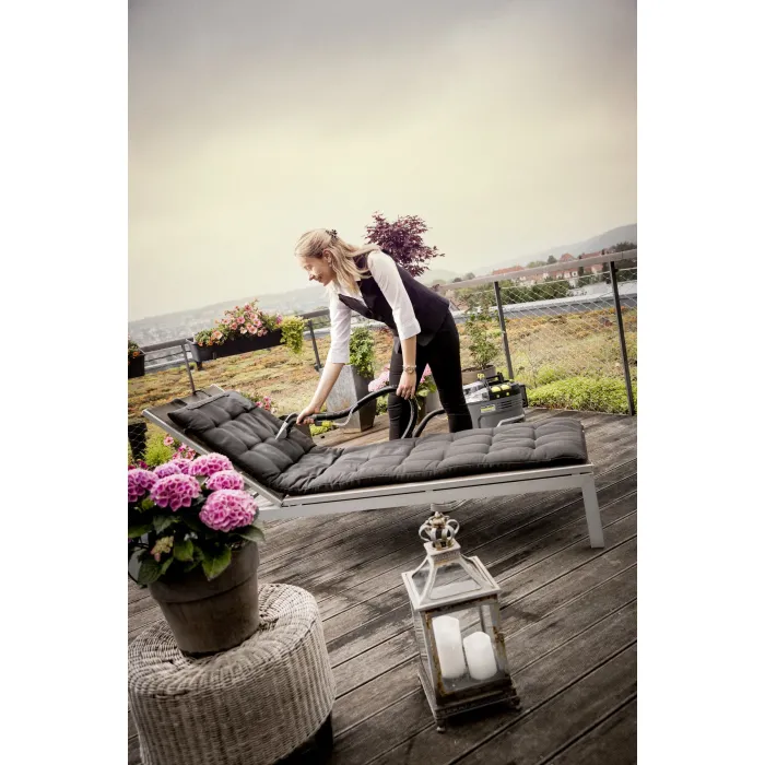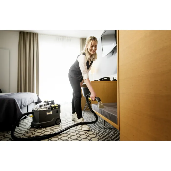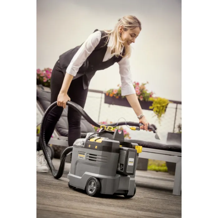Въпреки мощността си, тази Puzzi е изключително тиха, което я прави идеална за употреба в обществени помещения: плюс ергономично проектираната дръжка означава, че може лесно да се носи с една ръка. За най-добри резултати при почистване в дълбочина, почистващият разтвор се нагнетява и се впръсква дълбоко в текстилните влакна, след което се засмуква обратно заедно с разхлабената мръсотия. Стандартно се доставят: Изключително къса дюза за тапицерия, маркуч за прахосмукачка, контейнер 2 в 1 за прясна и мръсна вода, вградено място за съхранение на аксесоари и много други. Когато поръчвате тази версия на машината, моля, имайте предвид, че мощната 36 V батерия Kärcher Battery Power+ и съответното бързо зарядно устройство трябва да се поръчат отделно. Единствената по рода си в света, със здрава и безжична гъвкавост: Нашата безжична почистваща машина с екстракция и спрей Puzzi 9/1 Bp. Като единствената професионална машина с екстракция и спрей, захранвана с батерии, на пазара, тази Puzzi винаги впечатлява с изключителната си производителност и максимална свобода на движение при почистване на тапицерии и текстилни площи във всяка индустрия, независимо дали става въпрос за хотели или хотелиерство, почистване на превозни средства или сгради.
