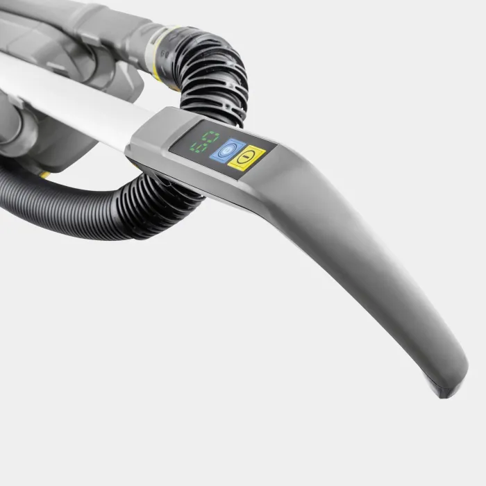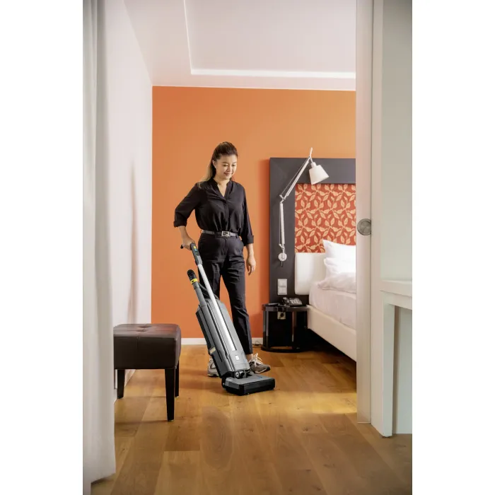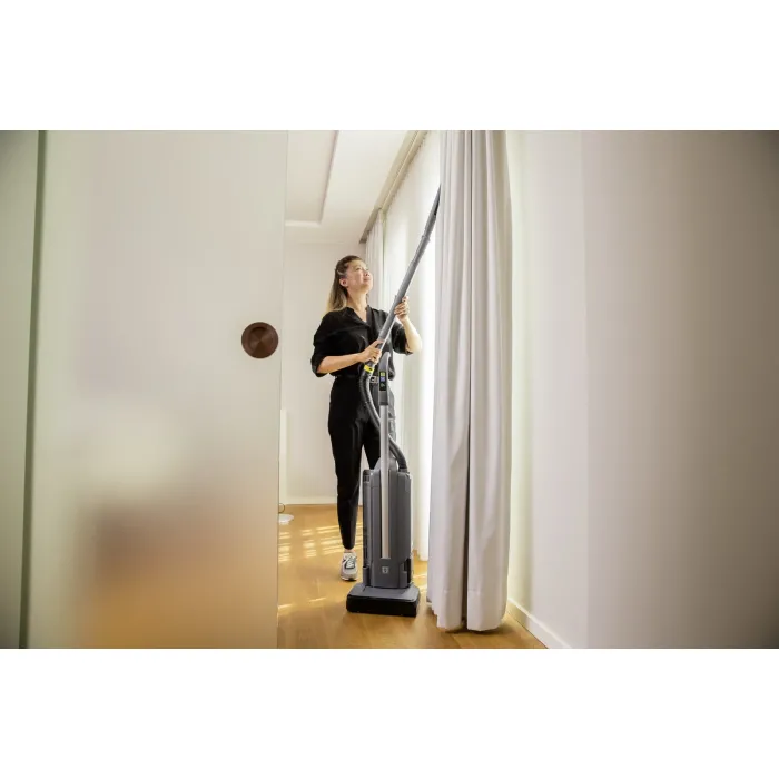 Влакната на текстилните подове се почистват старателно и видимо се изправят. С особено ниския си просвет, акумулаторната и маневрена вертикална прахосмукачка с вертикална четка е идеална за почистване на сгради или в хотелския сектор за почистване под легла и други съоръжения. Също така е практично: бързата и хигиенична функция за самопочистване на ролковата четка, която може да се активира удобно с крачен превключвател. С допълнителна повърхностна дюза като стандарт: Професионалната акумулаторна прахосмукачка с вертикална четка CV 30/2 Bp Adv впечатлява с отлични резултати от почистването и лекота на използване. Компактната 3-литрова акумулаторна прахосмукачка с вертикална четка е перфектно пригодена за всички килими и твърди повърхности благодарение на автоматичното разпознаване на подови настилки. Космите, събрани от ролковата четка, се отделят, а останалите се засмукват автоматично. Превключвателят ON/OFF, режимът eco!efficiency и LED дисплеят за оставащото време на работа на батерията на иновативната дръжка допълват машината. Моля, имайте предвид, когато поръчвате, че за CV 30/2 Bp Adv мощната батерия Kärcher Battery Power+ и съвместимото зарядно устройство трябва да се поръчват отделно. Предлага се опционално високоефективен HEPA-14 филтър.